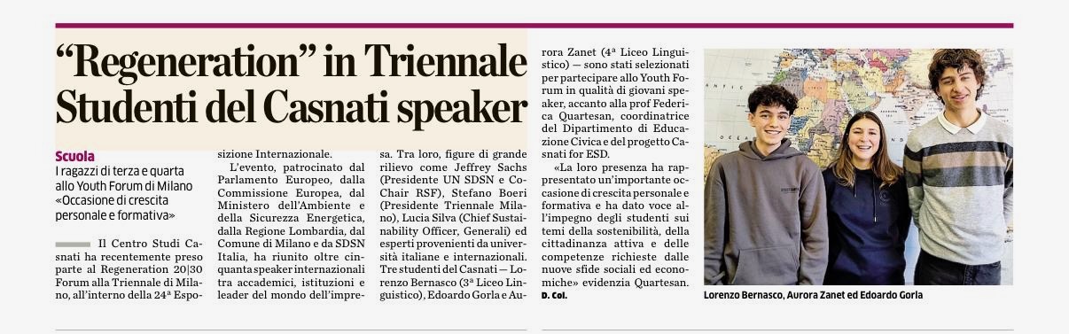 Al Regeneration 20|30 Forum alla Triennale di Milano, tra economisti, imprenditori, ricercatori e innovatori, c’era anche una scuola: il Centro Studi Casnati. Non come semplice ospite, ma come esempio concreto di come un istituto possa diventare un pezzo attivo della rigenerazione del proprio territorio.